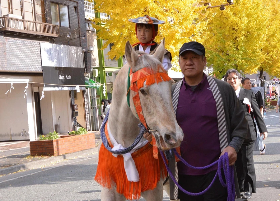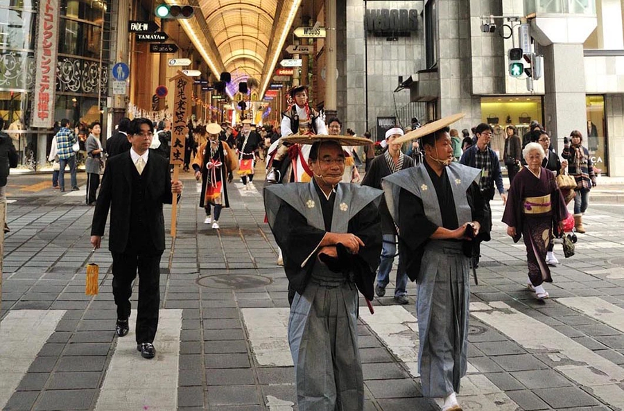 江戸時代、毛利氏が参勤交代のため萩から山口に来られた際、古熊神社の御神幸行列を迎え、警護をされていました。その故事に則り、参勤交代の行列を模した神役や備立行列などは、古熊神社ではなく八坂神社から出立し、途中札の辻(大市町にある萩往還と石見街道の合流点、古くは山口の中心地として札が建てられていました)にて、天神さまの御神幸行列を奉迎、そこから合流し約300名の大行列が山口の中心部を練り歩きます。
