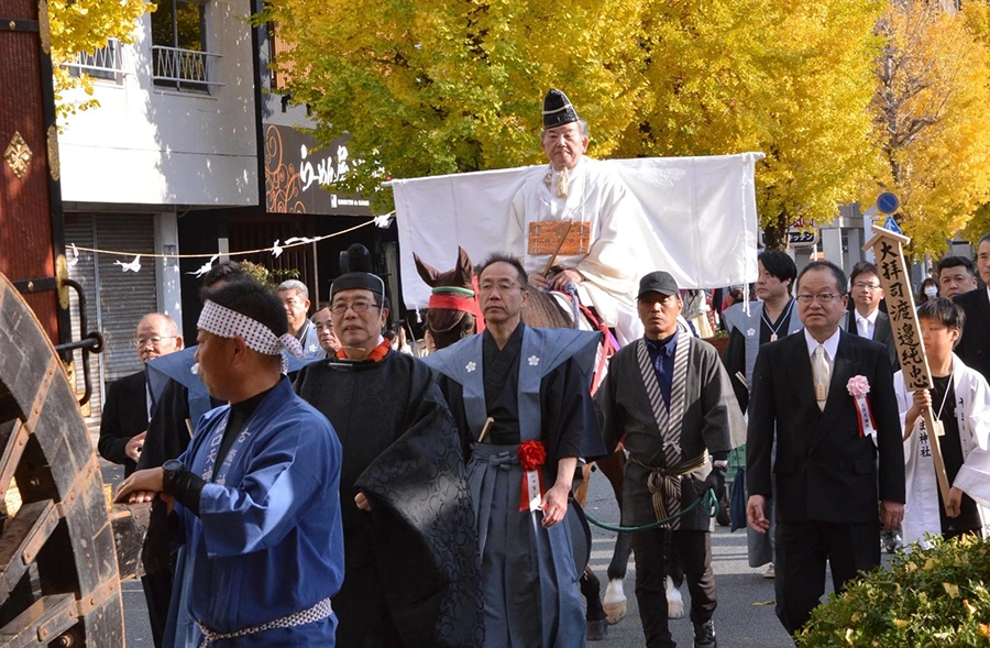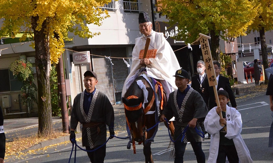 神役である『大拝司』と『小拝司』。大拝司(だいはいし)は山口天神祭の一切を取り仕切り、小拝司(しょうはいし)は大拝司を補佐します。