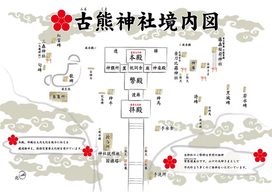 古熊神社境内図。応安6年(1373年)創建当初からの本殿と拝殿は、室町時代建築の特徴をよく残すものとして大変著名であり、国の重要文化財に指定されています。
