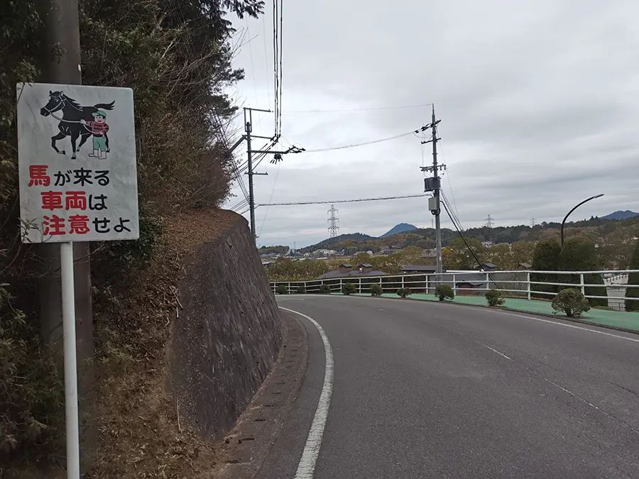 坂を上がった所から厩舎構内までは、一般の車も通る公道を馬を引っ張って歩いた。