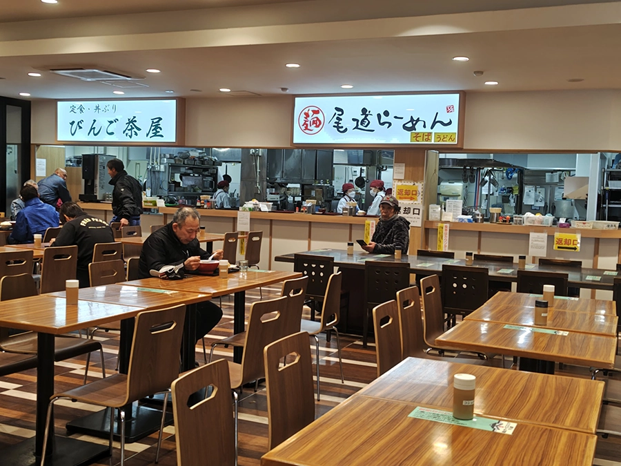 途中、ほとんどの馬運車が食事休憩で広島の福山サービスエリアで停まる。ここのフードコートは24時間営業で、朝早くても開いていて、朝昼兼用ご飯を食べる為に一斉に厩舎従業員たちが入ってくる。