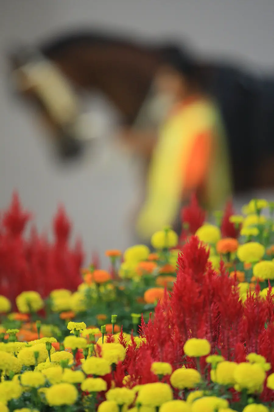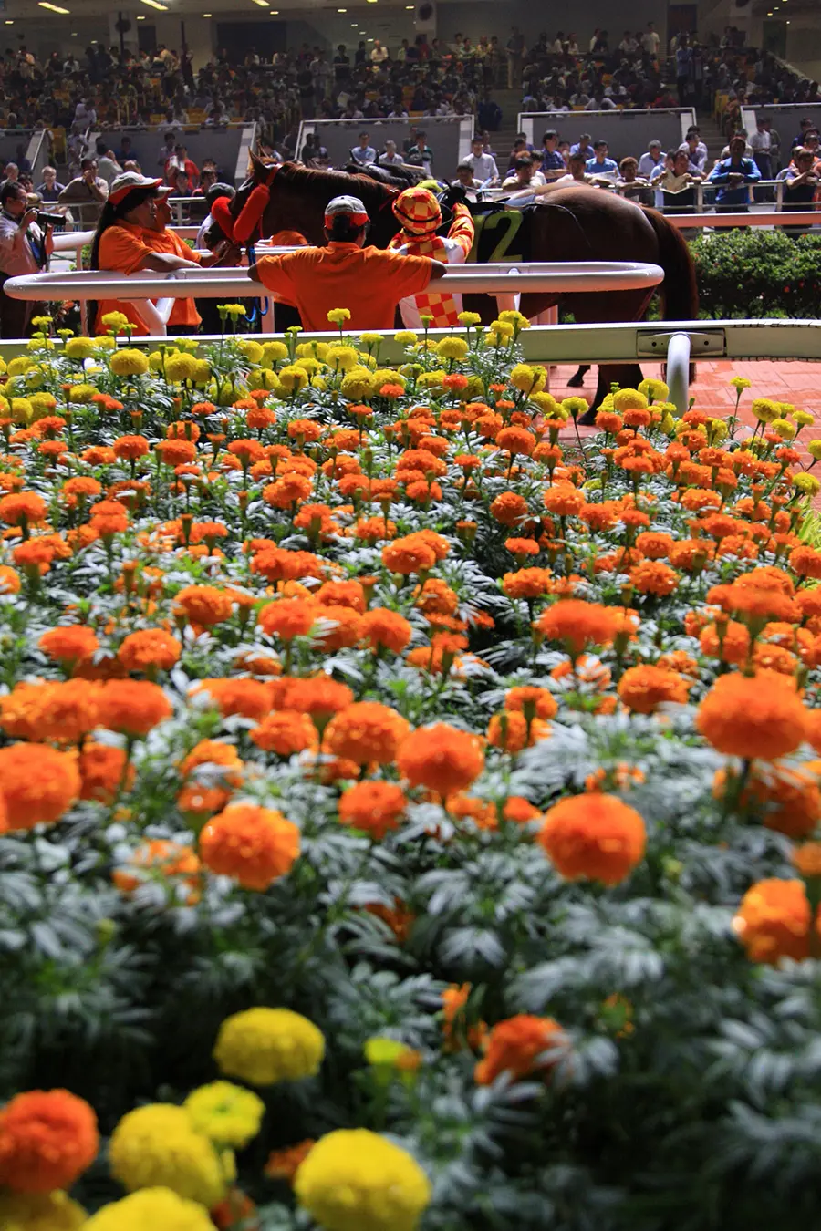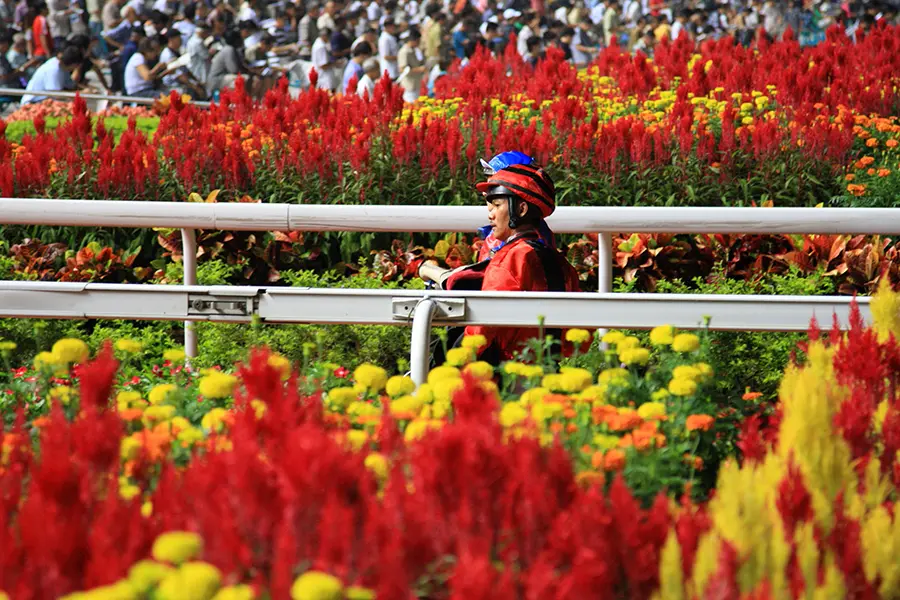 色鮮やかな赤色、黄色、オレンジ色の花がこれでもかと咲いており、日本の競馬場とは全然違う感覚で撮ることができる。