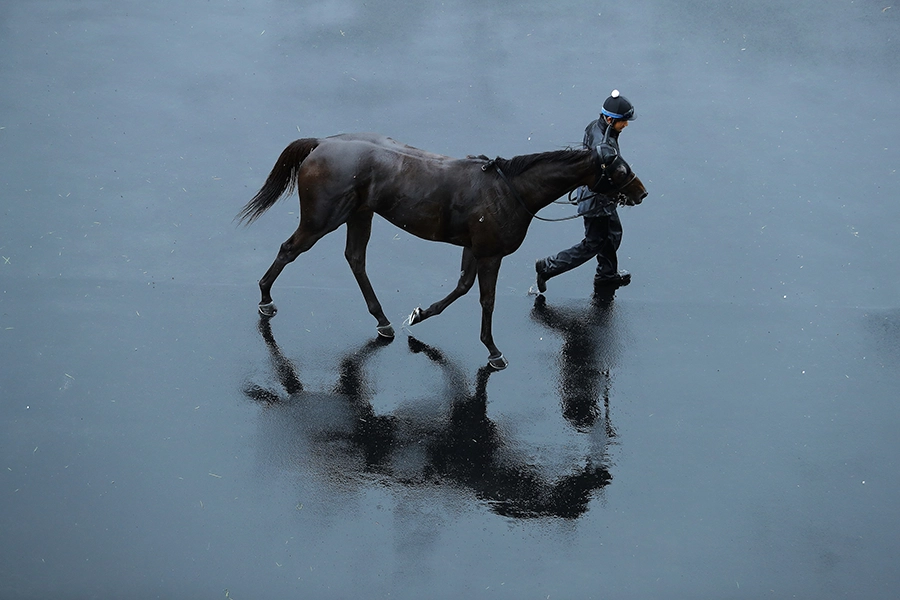 その水溜りに馬体が反射して、鏡のように見える。