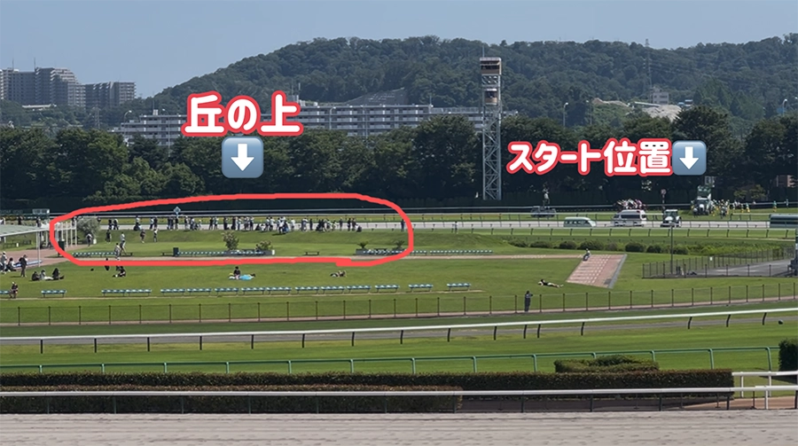 そう、この丘の上が1400mや1600mのレースのスタートを1番近くで見られるんですよ。