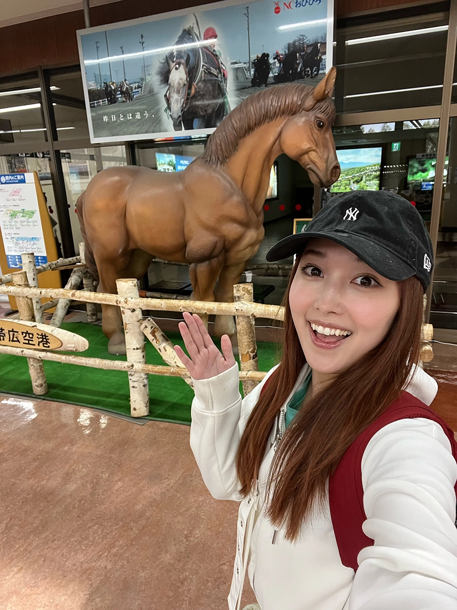帯広空港の『ばん馬』の実物大の模型にお出迎えしてもらい🛷