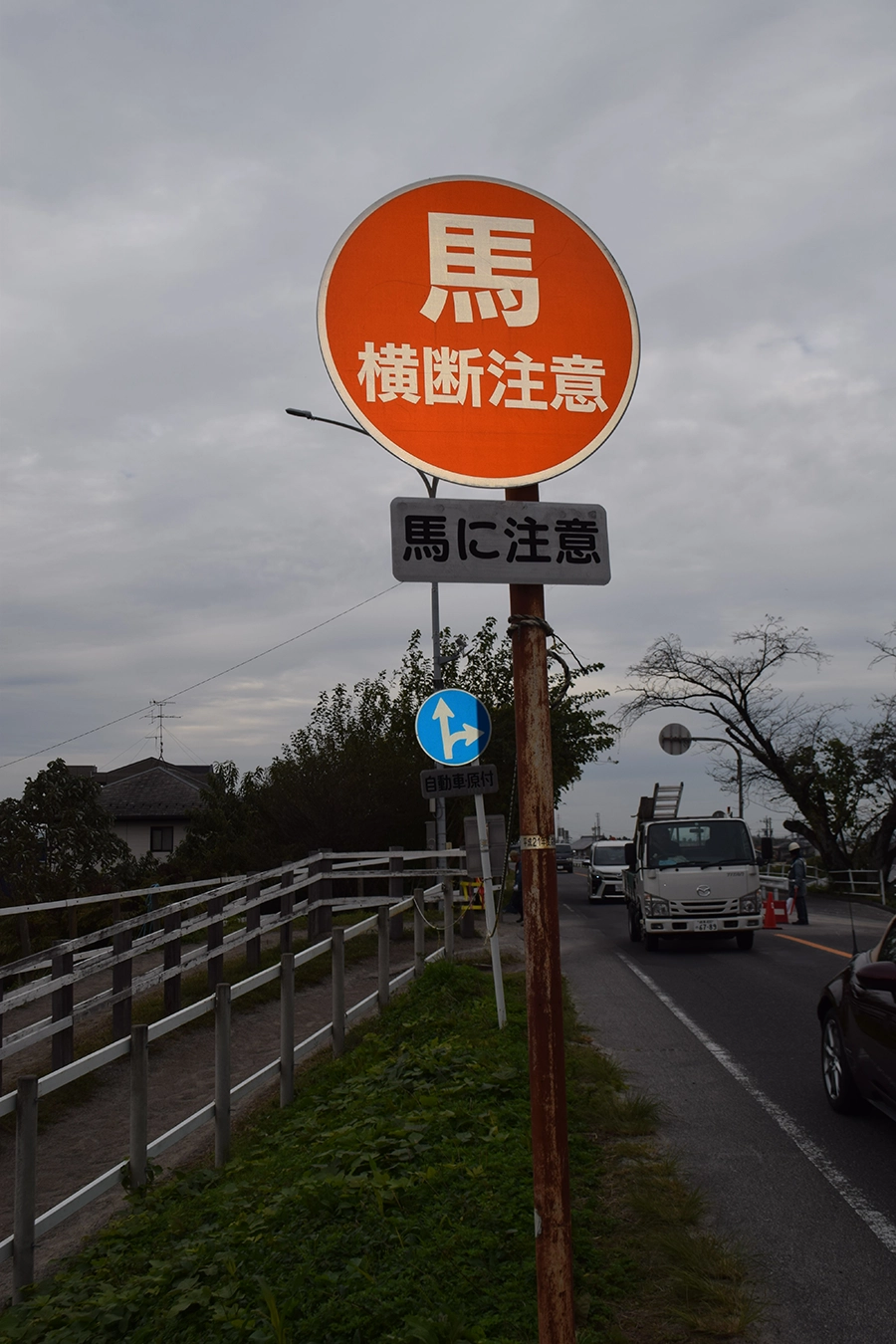 別の坂を上がり、専用馬道が土手の上の道路と交差する地点へ。朝はここに警備員が立ち、車を止め、馬を渡らせるのだ。この風景も夕方のニュースワイドで見た。土手沿いの車道は相当な交通量で、これは危険だろうな、とは思う。