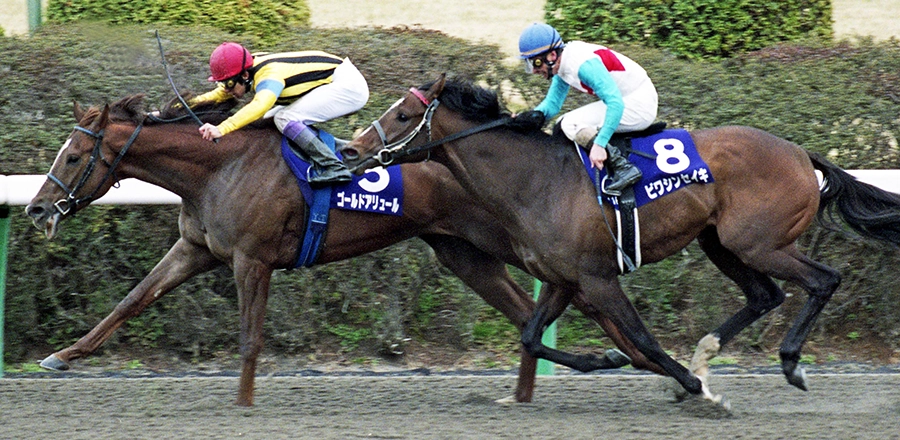 逃げたカネツフルーヴをかわしつつ、背後から蹄音が聞こえた。それまでの位置取りや流れから、間違いなくビワシンセイキだと武豊騎手は確信した。
